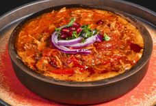 400 г • Тушеная в томатном соусе курочка со специями. Подаём на глиняной сковородке «кеци»
