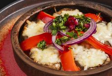 300 г • Шляпки шампиньонов, запечённые с имеретинским сыром. Подаём на глиняной сковородке «кеци»